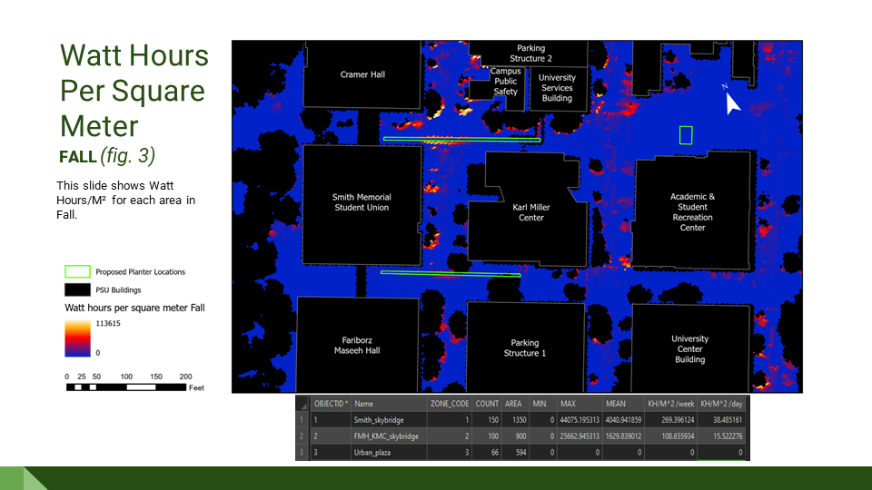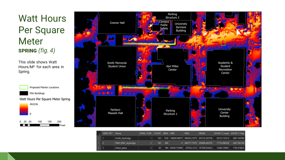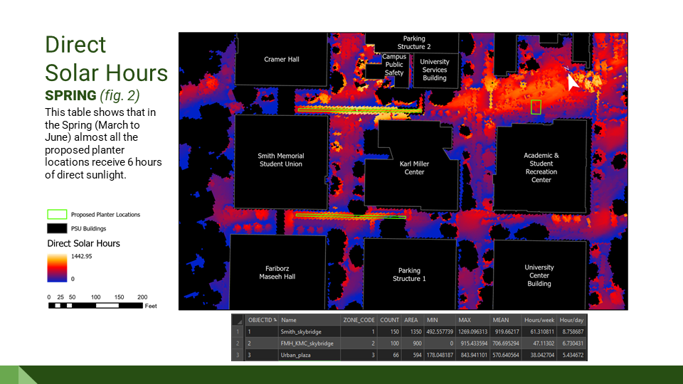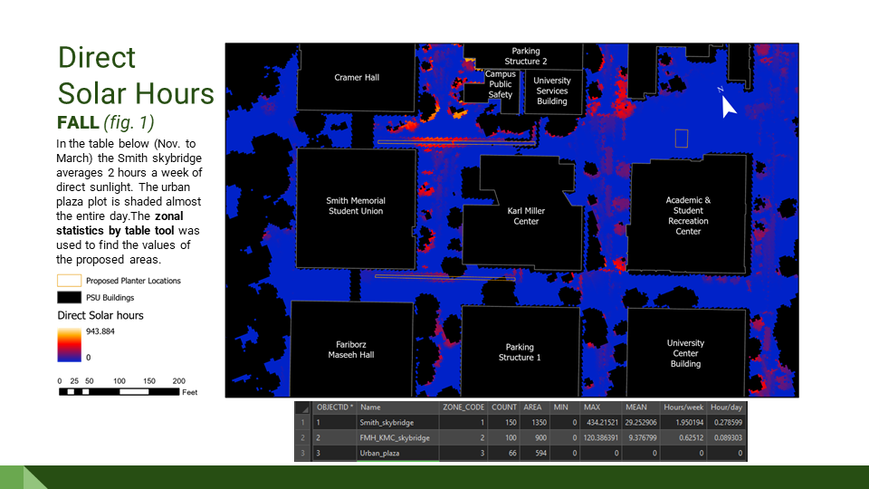 Portland State University (PSU) is a very urban campus with limited sunlight because of it’s tall buildings and dense tree canopy. This creates a challenging environment for ornamental plants to survive. By identifying the solar intensity across campus facilities staff can locate the ideal locations for ornamental plants. Different plants require varying levels of solar intensity. This analysis results in a map of proposed planter locations and their solar intensity values which allows staff to match ornamental plants to those locations. For this study campus leadership in the past asked if it would be possible to add some above ground planting containers at the proposed locations selected in this study. Using a 3 foot digital elevation model (DEM) and a 3 foot digital surface model (DSM) based on ground point and first return LiDAR data I clipped PSU’s campus and some surrounding buildings. The DEM and DSM were supplied by Metro’s Regional Land Information System. I then used ESRI’s solar radiation tool kit to map the effects of the sun over PSU for two distinct planting seasons, Fall (Nov. to March) and Spring (end of March to end of June). To identify the sun’s effect on campus I ran the Area Solar Radiation tool in ArcGIS Pro. With this analysis I was able to confirm full sun (6+ hours) of ornamental plants will succeed at the proposed locations on campus. Yarrow, Heather, Mahonia and Hellebore should all do well on both Sky Bridges based on the amount of sun they receive.
